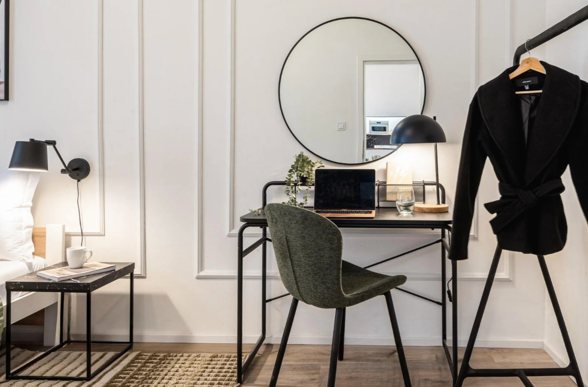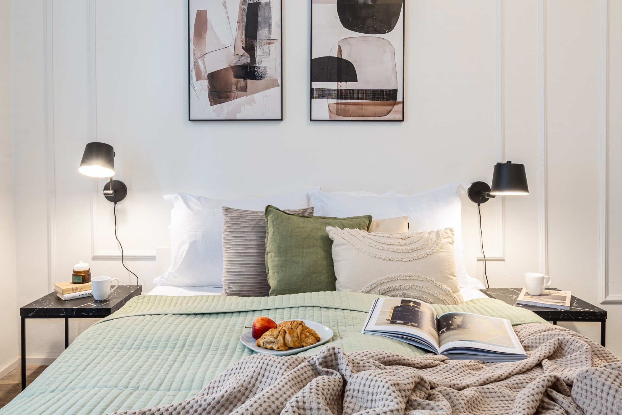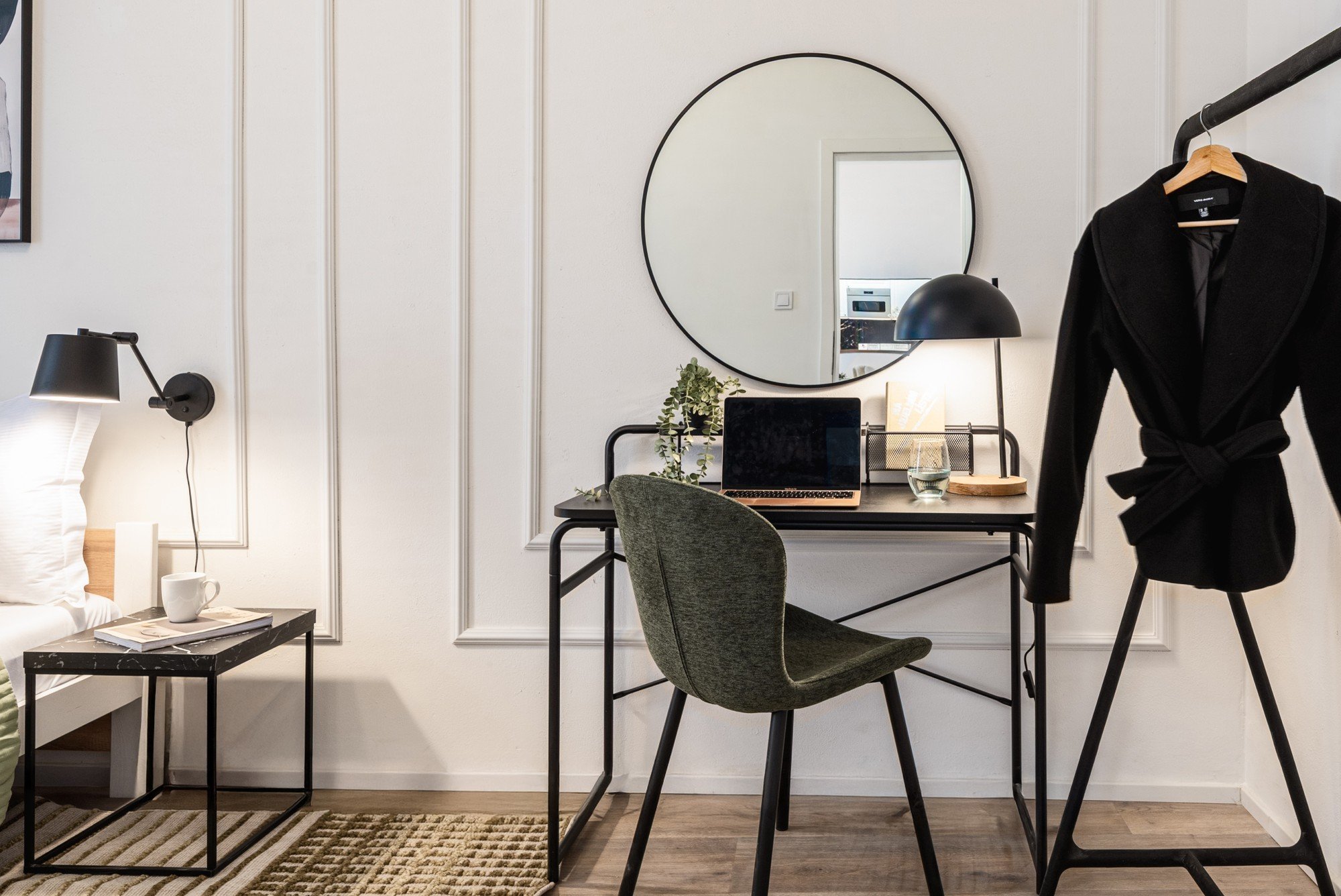 Acest apartament cu 3 camere impresionează prin caracterul inconfundabil. Pereții cu plinte decorative, accentele aurii și canapelele distinctive, care făceau deja parte din interior, au devenit punctul de plecare al întregului concept. Noul design a pus accentul pe mai multă lumină și pe aspectul funcțional pentru a face ca apartamentul să corespundă nu numai din punct de vedere estetic, ci și practic pentru tipul de închiriere pe termen scurt.