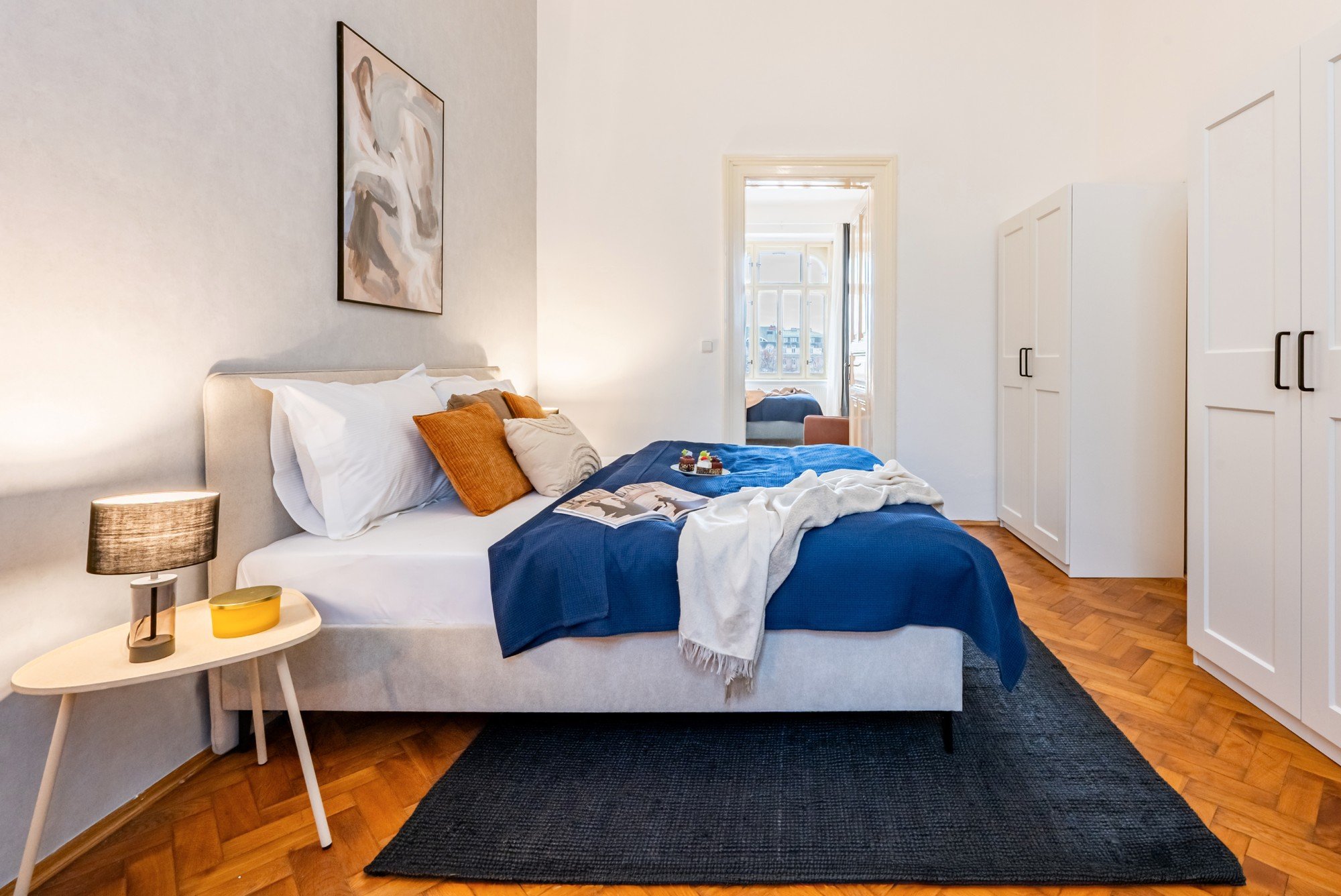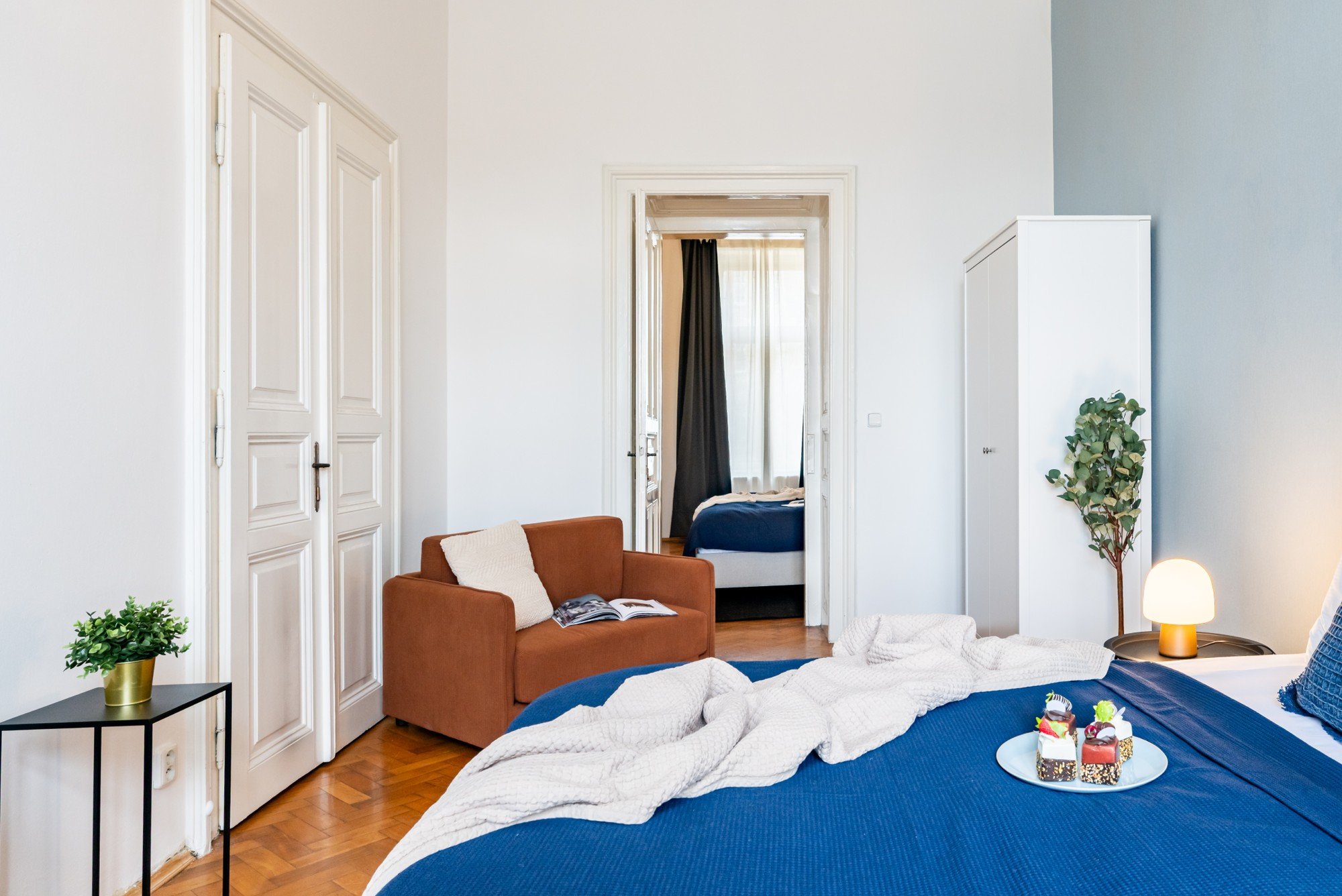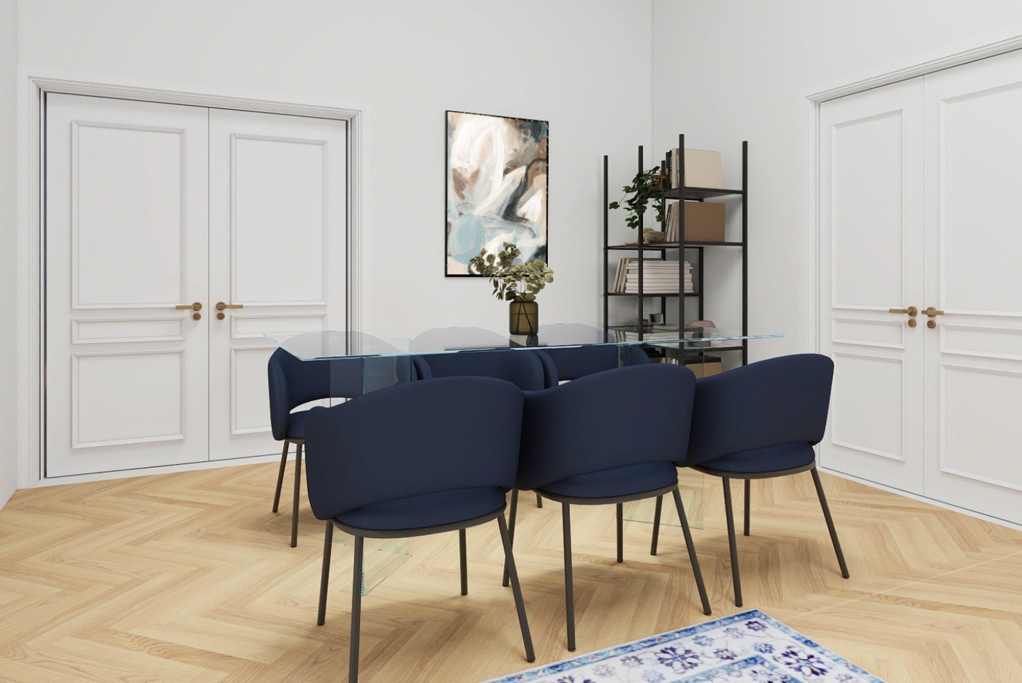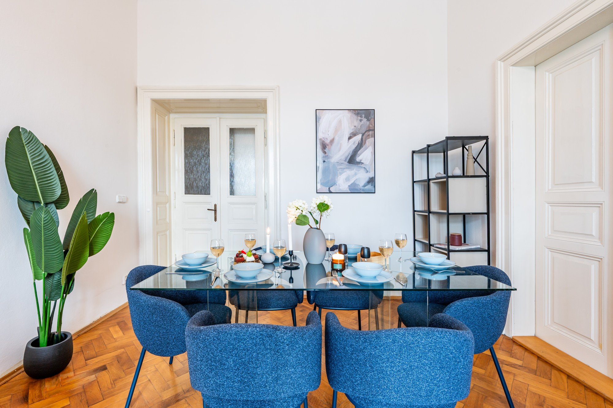 Plafoanele înalte, parchetul original și contrastul lemnului închis la culoare cu nuanțele moi de albastru creează un interior atemporal, calm, elegant și confortabil în mod natural. O amenajare concepută pentru viața de zi cu zi și pentru socializare demonstrează că atât confortul, cât și caracterul practic se pot combina cu succes.