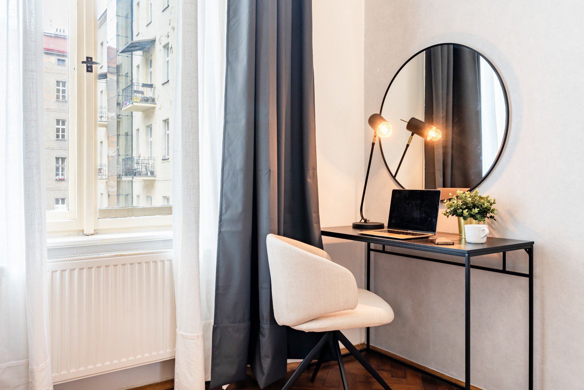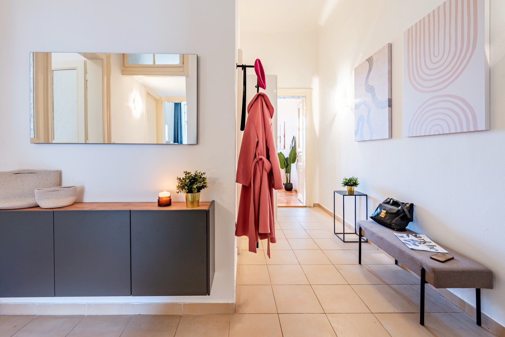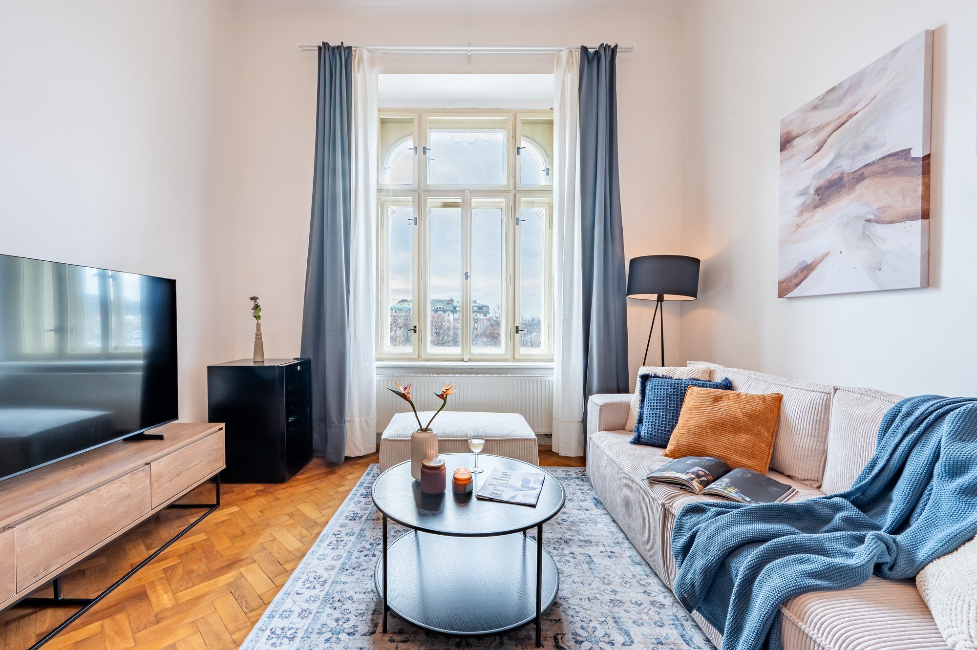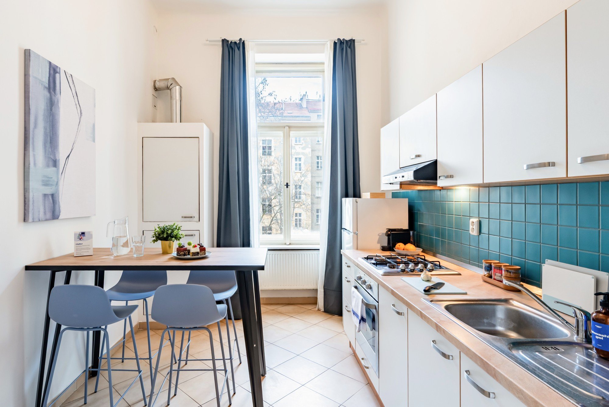 Plafoanele înalte, parchetul original și contrastul lemnului închis la culoare cu nuanțele moi de albastru creează un interior atemporal, calm, elegant și confortabil în mod natural. O amenajare concepută pentru viața de zi cu zi și pentru socializare demonstrează că atât confortul, cât și caracterul practic se pot combina cu succes.