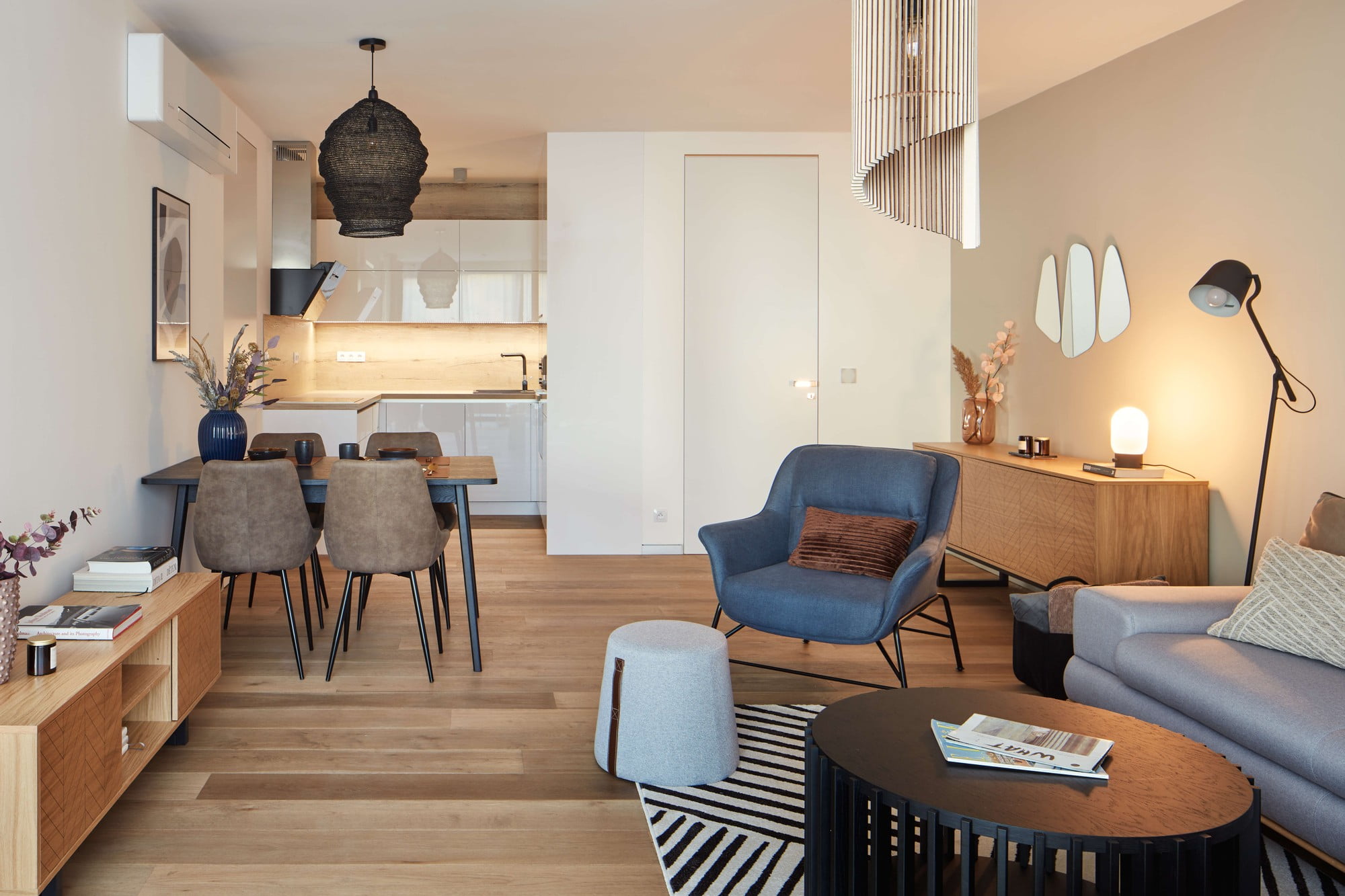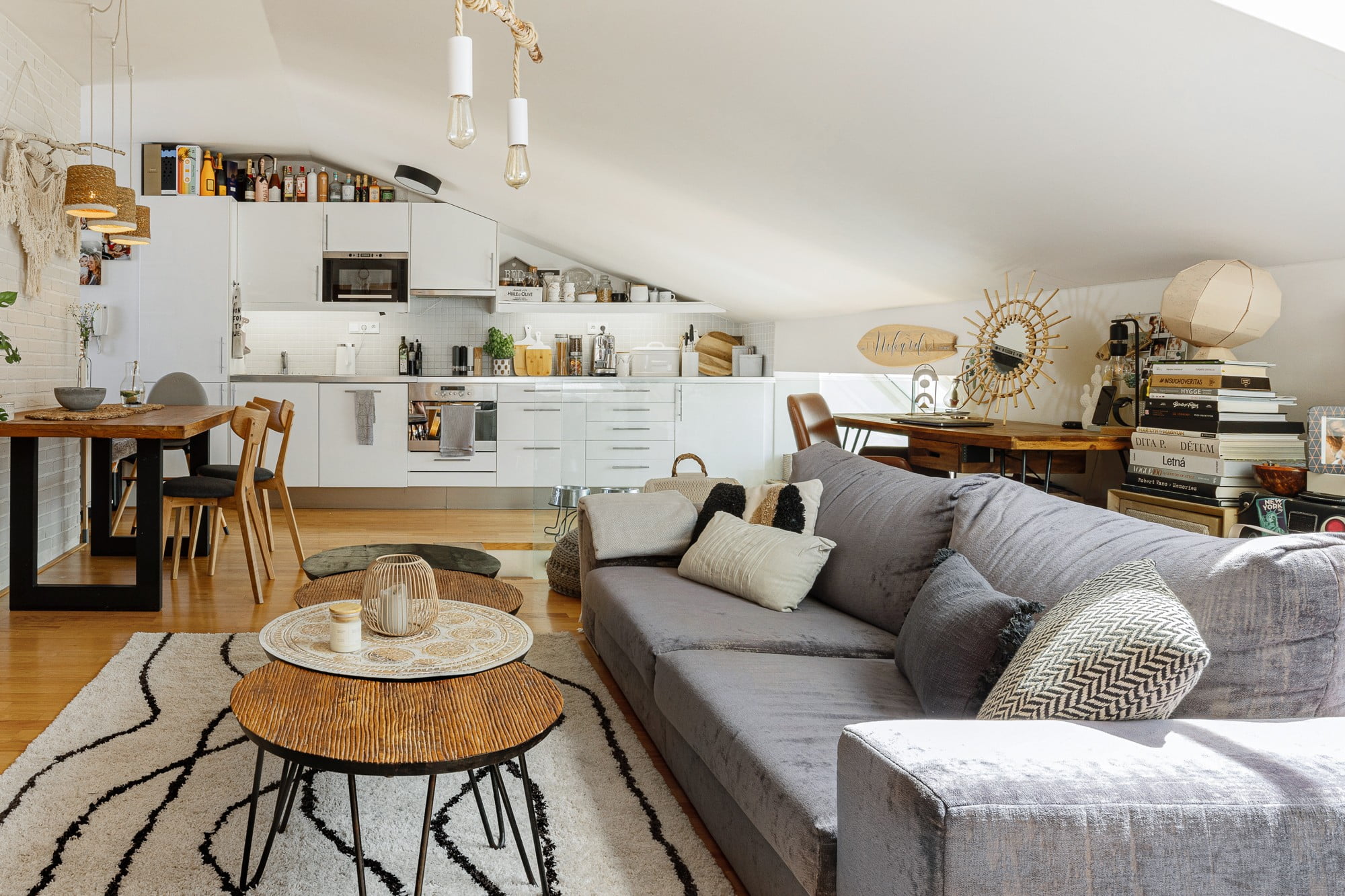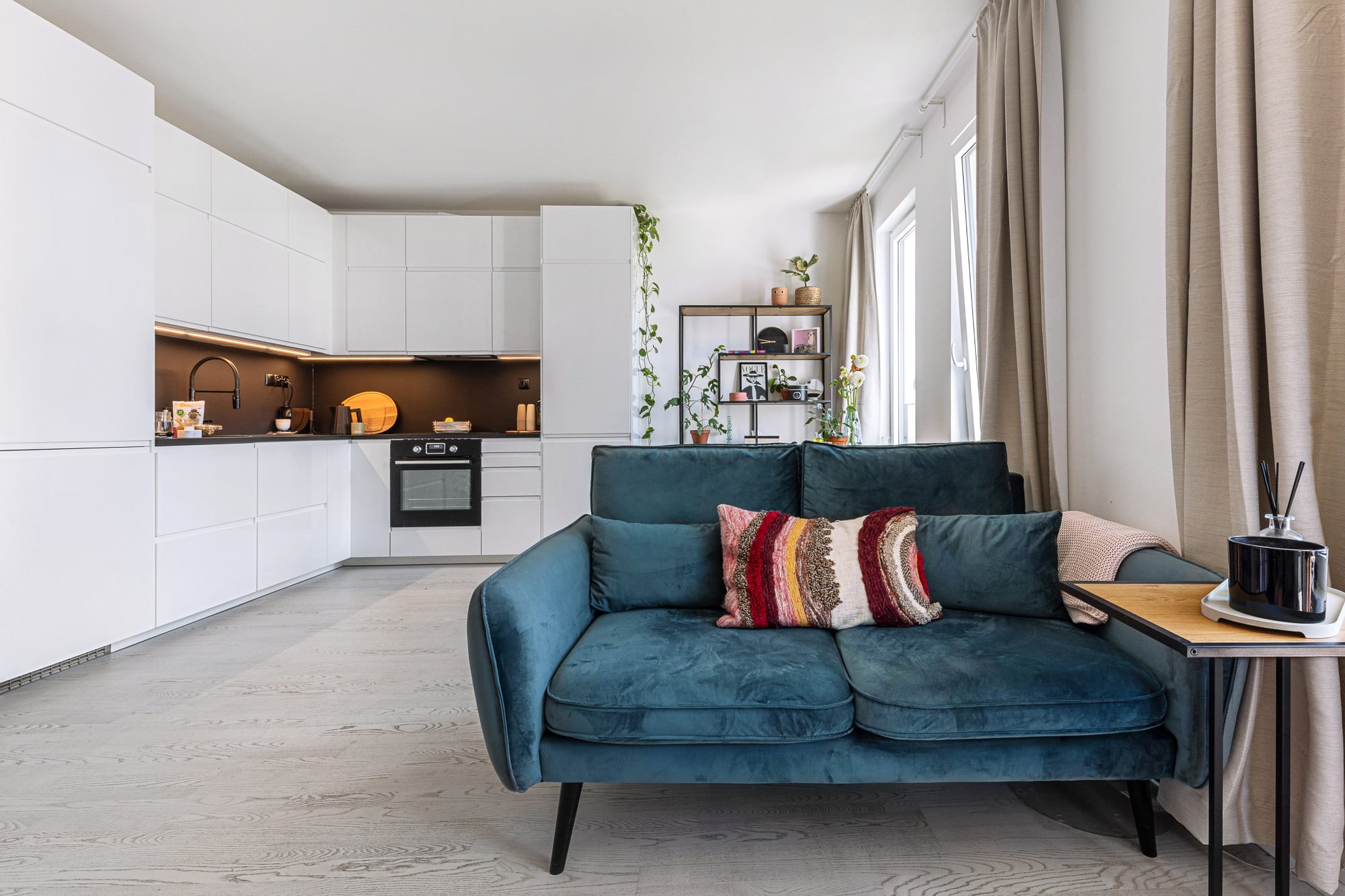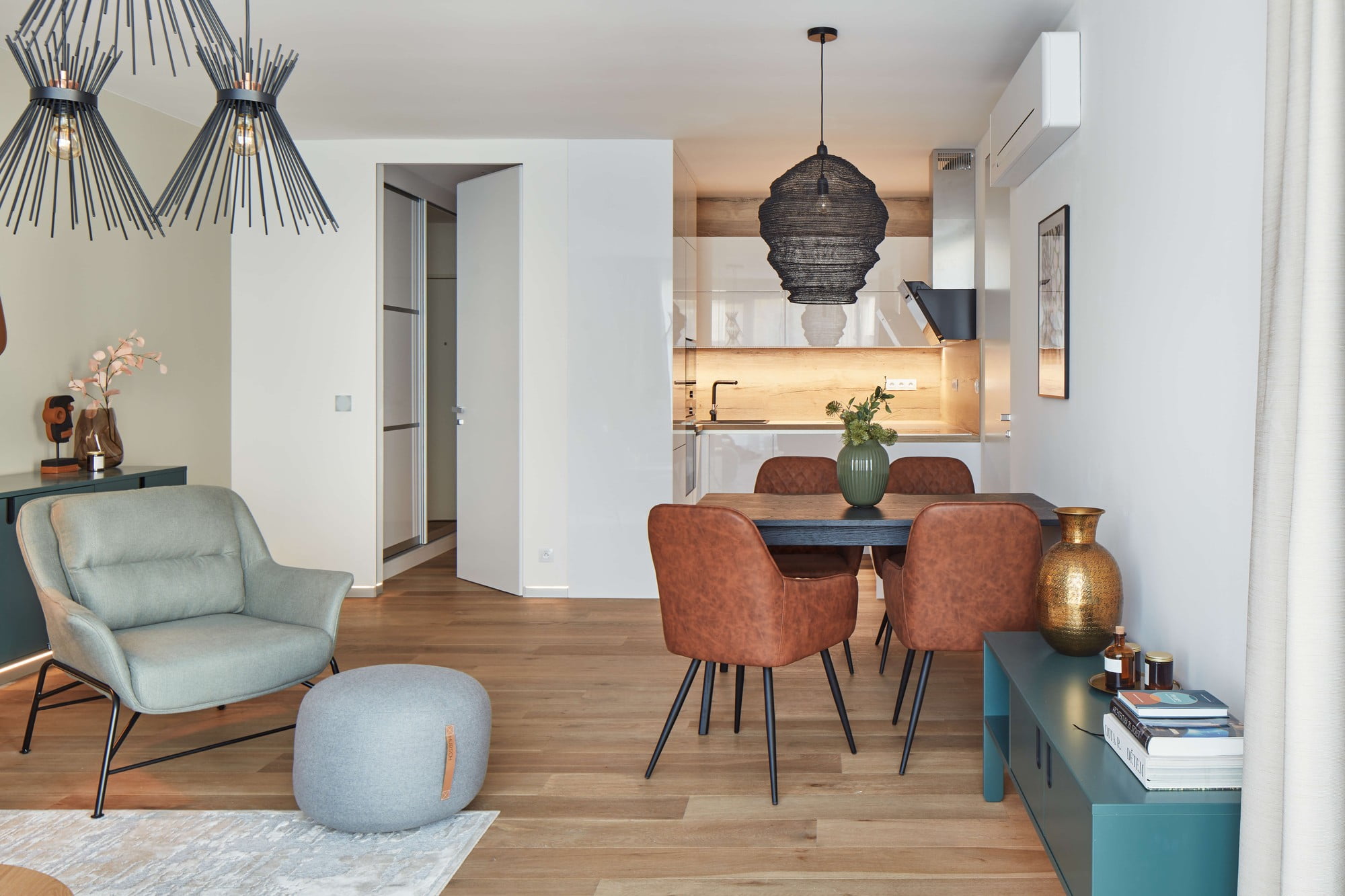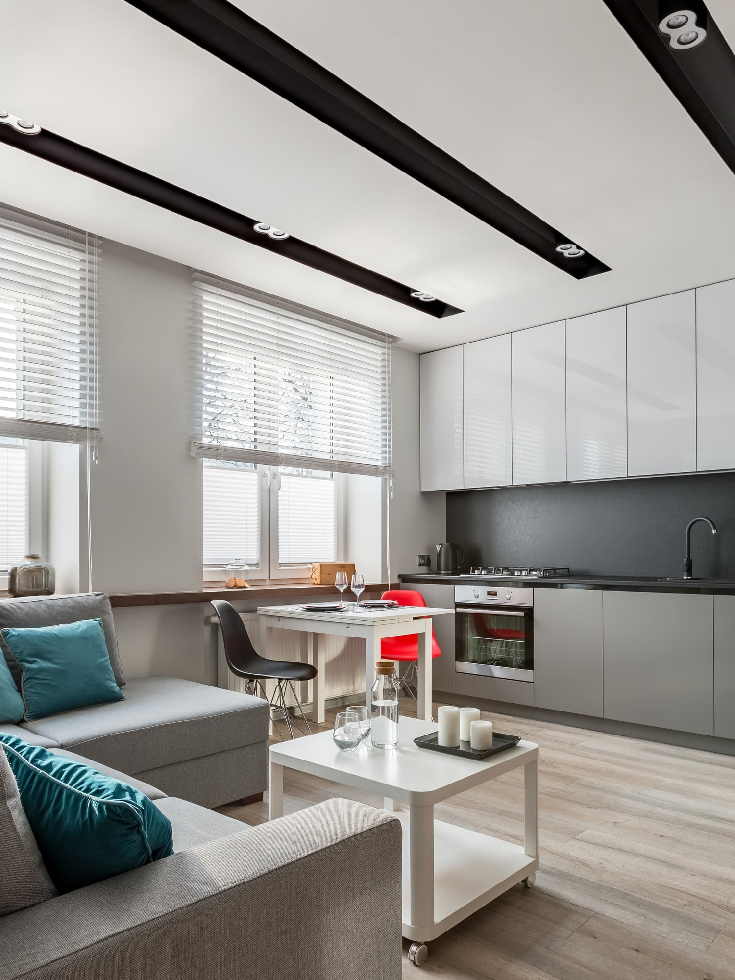 Bucătăria și livingul sunt într-o singură încăpere, dar îndeplinesc două funcții diferite, de aceea corpurile de iluminat centrale ar trebui să existe pentru fiecare dintre cele 2 zone. Astfel, spațiul va fi mai bine iluminat și împărțit imaginar în două zone separate. În sufragerie, pe lângă corpul de iluminat principal, adaugă și o sursă locală de lumină – poate fi mai caldă și mai difuză – pentru a ilumina tablourile sau pentru a crea o atmosferă mai confortabilă în colțul de lectură.