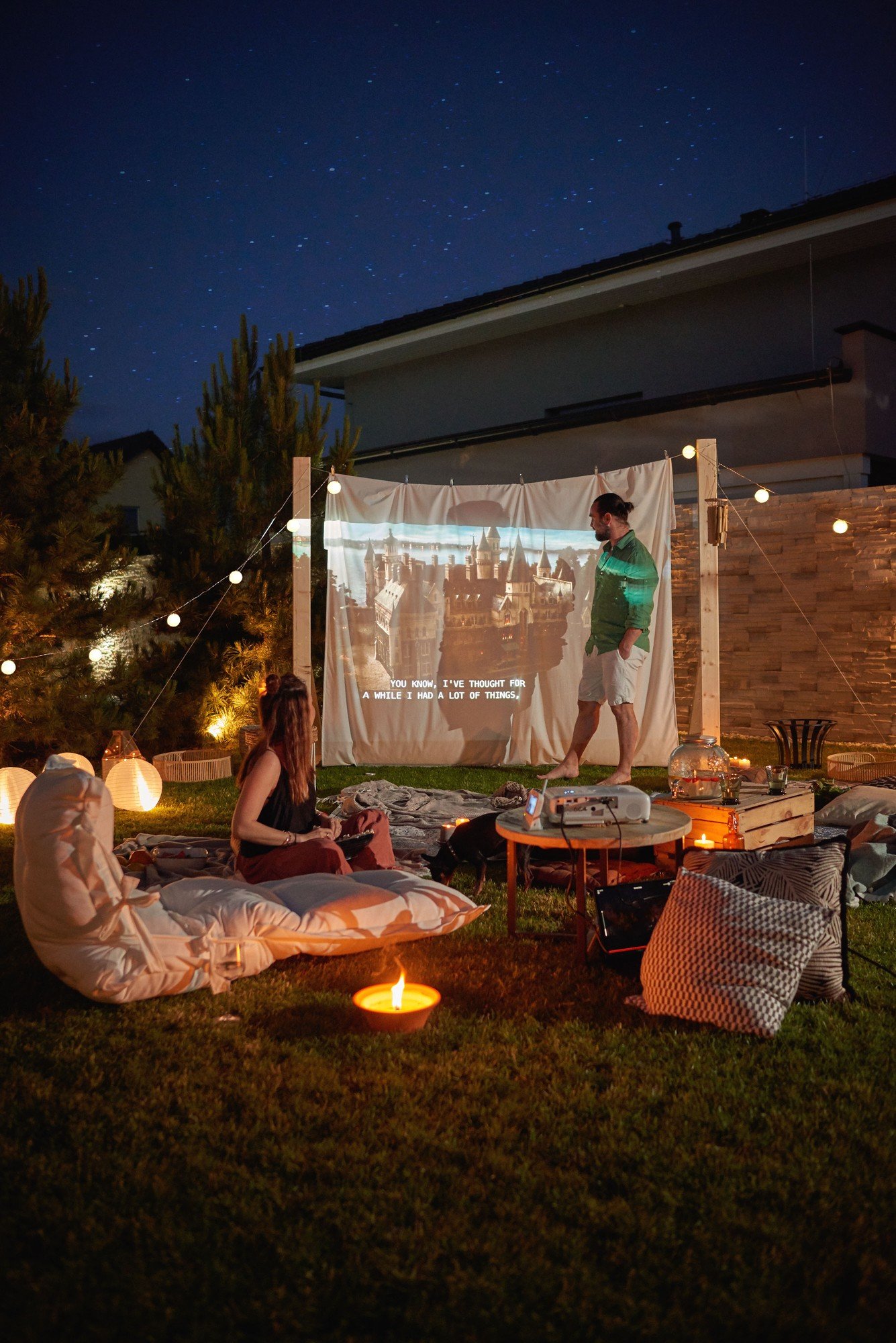 Un videoproiector cu difuzor încorporat și telecomandă este ideal - îl poți opri atunci când rămâi fără popcorn în timpul filmului. Veronica și echipa Bonami au reușit să instaleze rapid un ecran de proiecție folosind un cearșaf alb, doi stâlpi din lemn, o frânghie și câteva cârlige de rufe. Dar poți proiecta filmul sau fotografiile chiar și pe peretele casei.