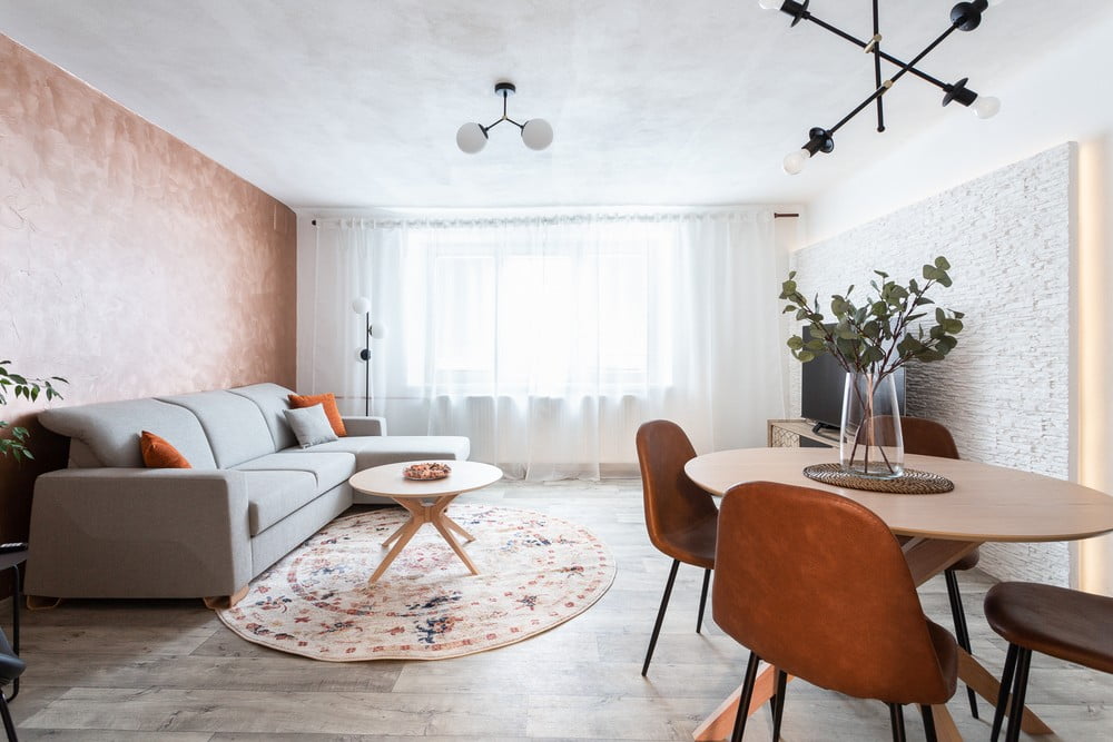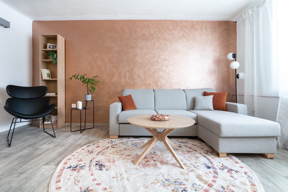 Covorul rotund și pernele decorative de culoare ruginie completează confortul ambiental.