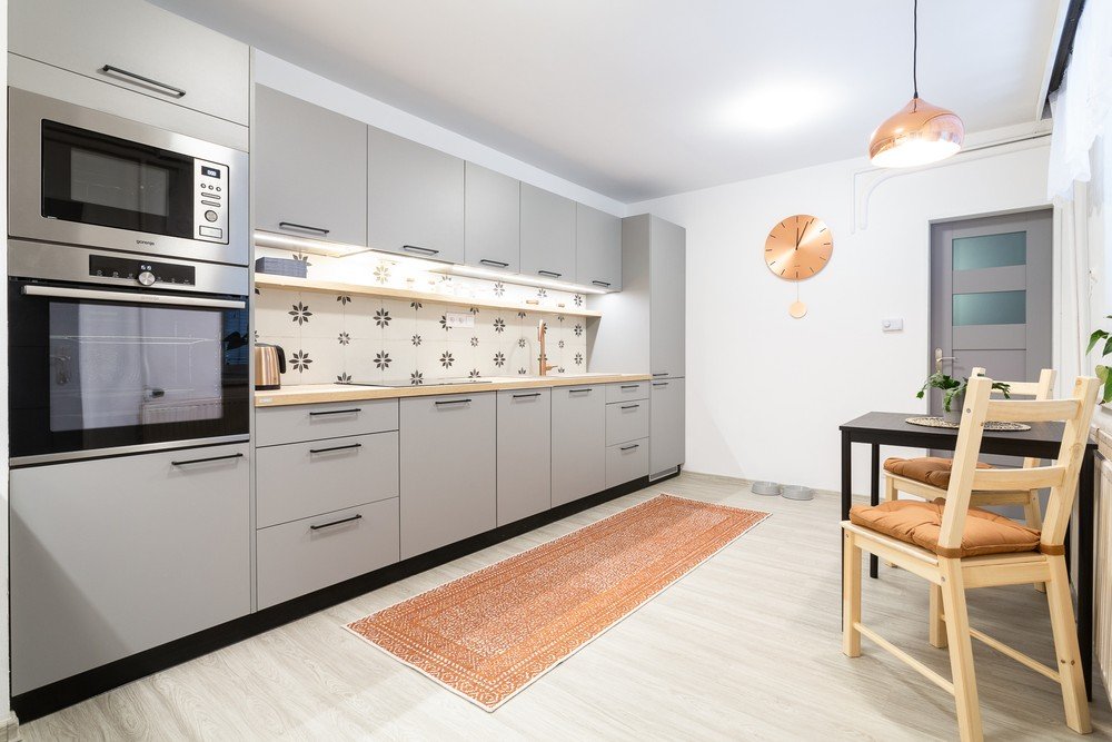 Un alt element remarcabil al bucătăriei a fost faianta în stil vintage, asortată cu dulapurile de bucătărie minimaliste de culoare gri.