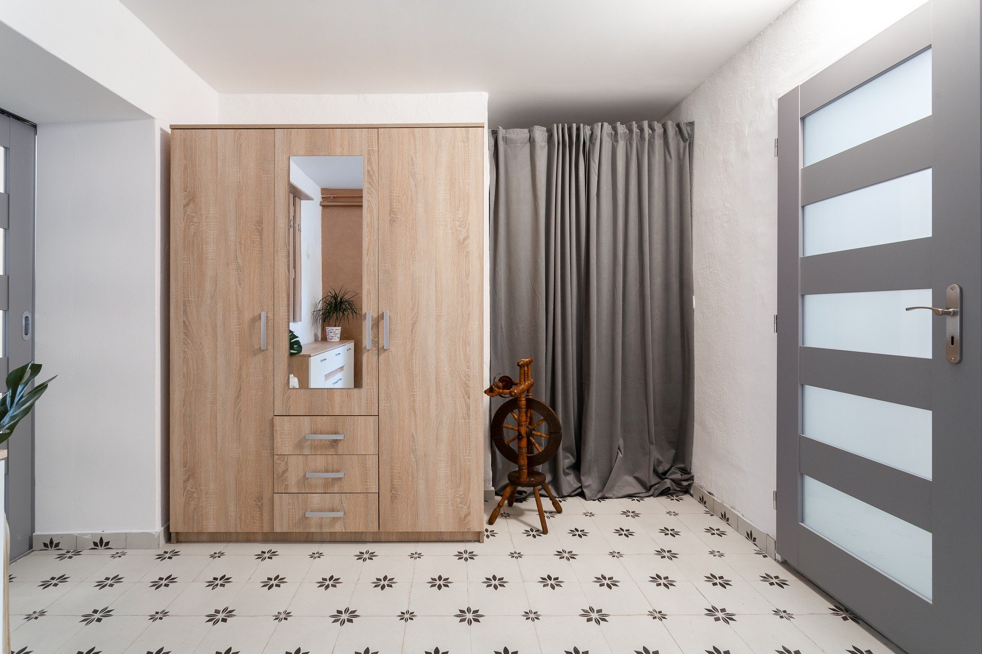 Au optat și pentru designul simplu al piesele de mobilier - un pat cu tăblie tapițată gri, o măsuță auxiliară din metal și o comodă într-o combinație de alb și lemn deschis. Amplasarea unei oglinzi mari a creat un colț de cosmetică.