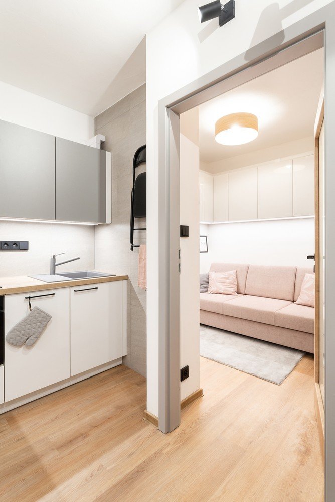 O bucătărie simplă, gri și albă, cu uși lucioase, se potrivește perfect acestui concept, făcând interiorul vizual mai mare și dându-i un aspect modern.Deoarece bucătăria nu dispune de o sursă de lumină naturală, designerii au încercat să asigure cel puțin suficientă lumină artificială cu ajutorul mai multor lămpi de perete cu brațe mobile.