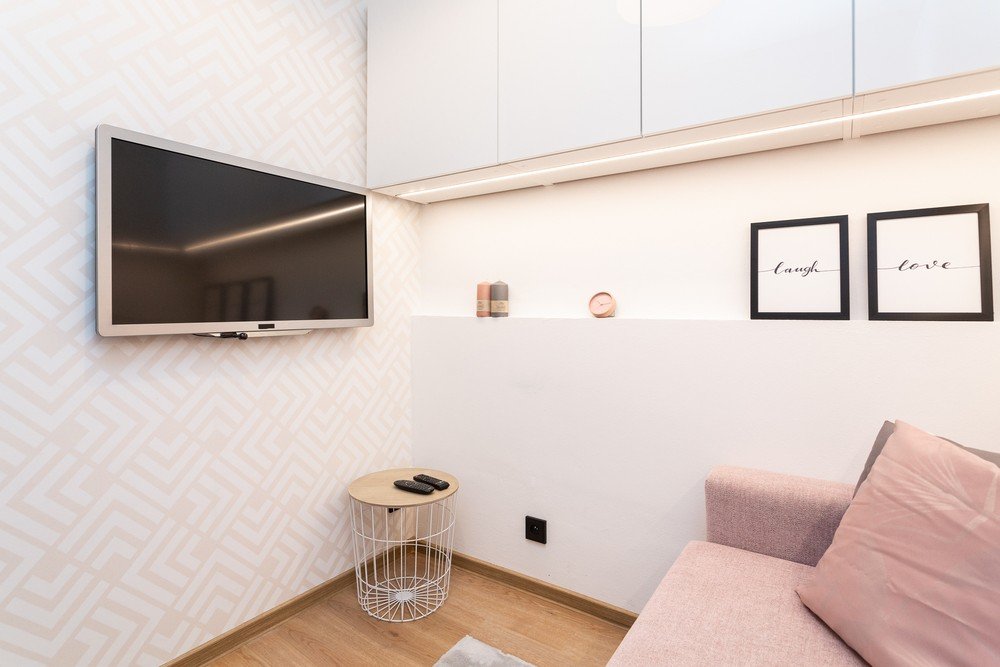 Au fixat televizorul pe perete și au adăugat o masă de depozitare ușoară în colț.