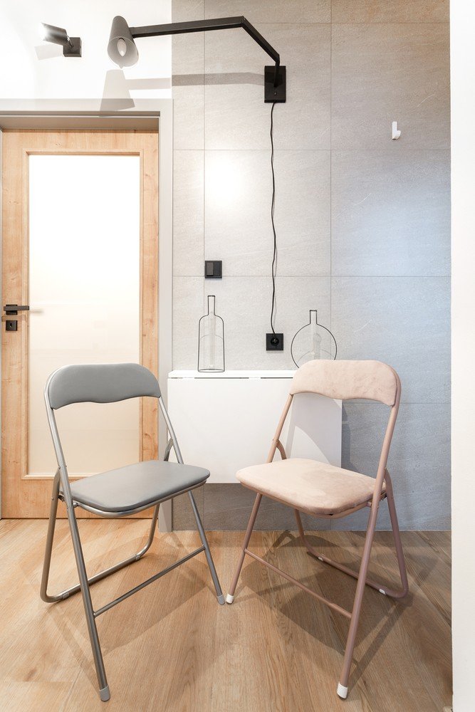 Zona de relaxare a fost proiectată cu o masă pliantă de perete și scaune pliante subtile care pot fi atârnate pe peretele cu faianță gri. Faianța îl protejează de murdărie și aduce, de asemenea, o doză de minimalism în interior.