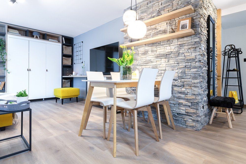 Prin amplasarea zonei de dining în fața peretelui din piatră au separat subtil bucătăria de living. Și aici au preferat simplitatea designului. Pentru scaunele și masa de dining, au optat pentru o formă elegantă în stil scandinav și o combinație de alb și lemn deschis.