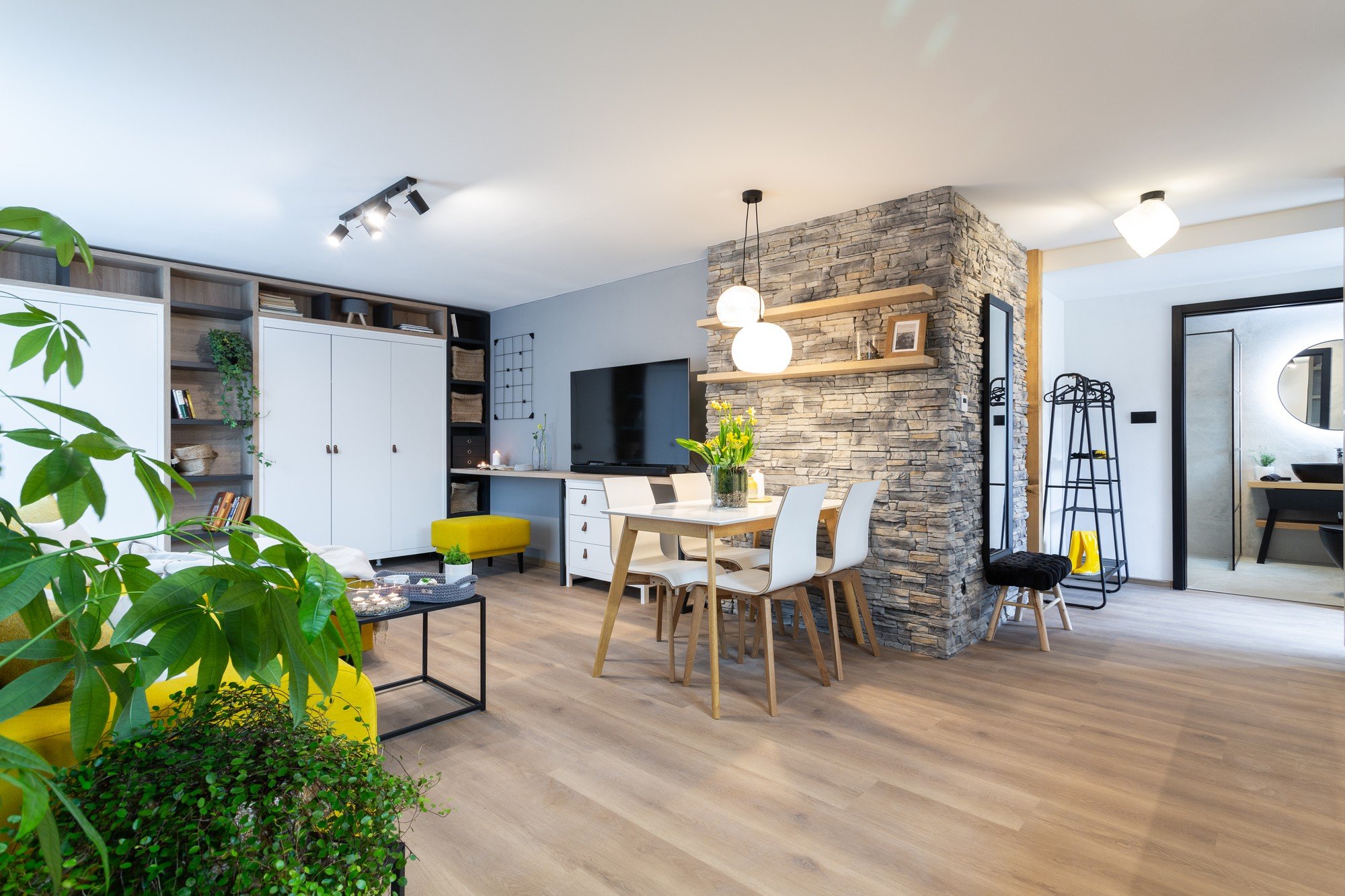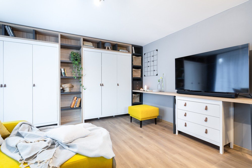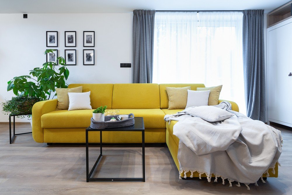Pentru ca interiorul să nu pară plictisitor, aceștia l-au înviorat cu o canapea galbenă, care poate fi transformată cu ușurință într-un pat dublu confortabil. Au completat-o cu un set de măsuțe de cafea minimaliste de culoare neagră, ușor de manipulat.