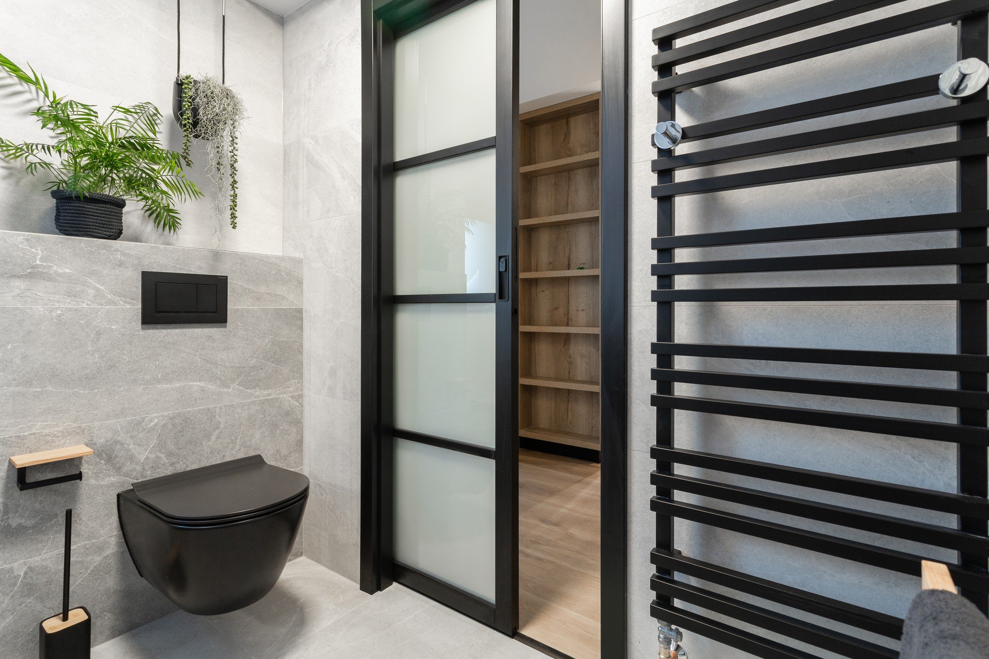 Caracterul industrial a fost accentuat și de caloriferul negru, ușile glisante, dar și de cuierul amplasat pe coridor.