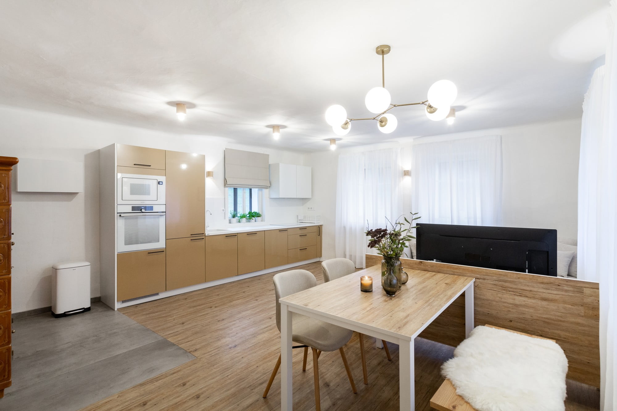 Designerii au plasat masa în mijlocul zonei de dining pentru mai multe locuri în jurul mesei. La scaunele bej tapițate bej au adăugat o bancă din lemn, acoperită cu blană, care a creat o atmosferă confortabilă și caldă pentru întreaga zonă de relaxare, făcând în același timp referire la istoria veche de secole a casei.