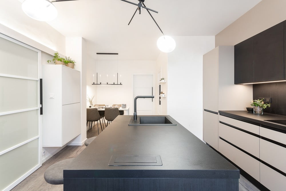 În bucătărie, insula cu robinetul negru și chiuveta spațioasă domină spațiul și separă bucătăria de zona de dining. Pentru iluminat, au folosit o lustră cu trei brațe de culoare neagră deasupra insulei și o lustră deasupra mesei de dining, care ne amintește de un candelabru cu lumânări aprinse pentru o lumină blândă și romantică.