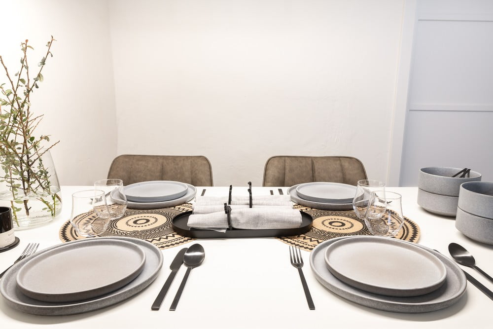 Scaunele din imitație de piele întoarsă închisă la culoare creează o zonă elegantă cu o masă dining care lasă să iasă în evidență suporturile de farfurii crem și setul de vase din gresie gri.