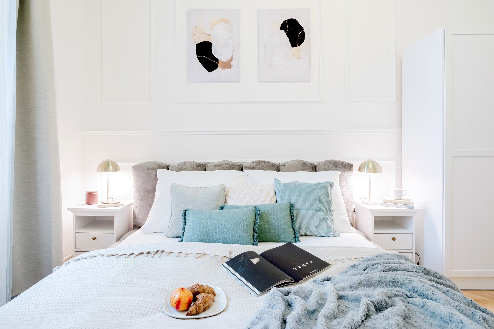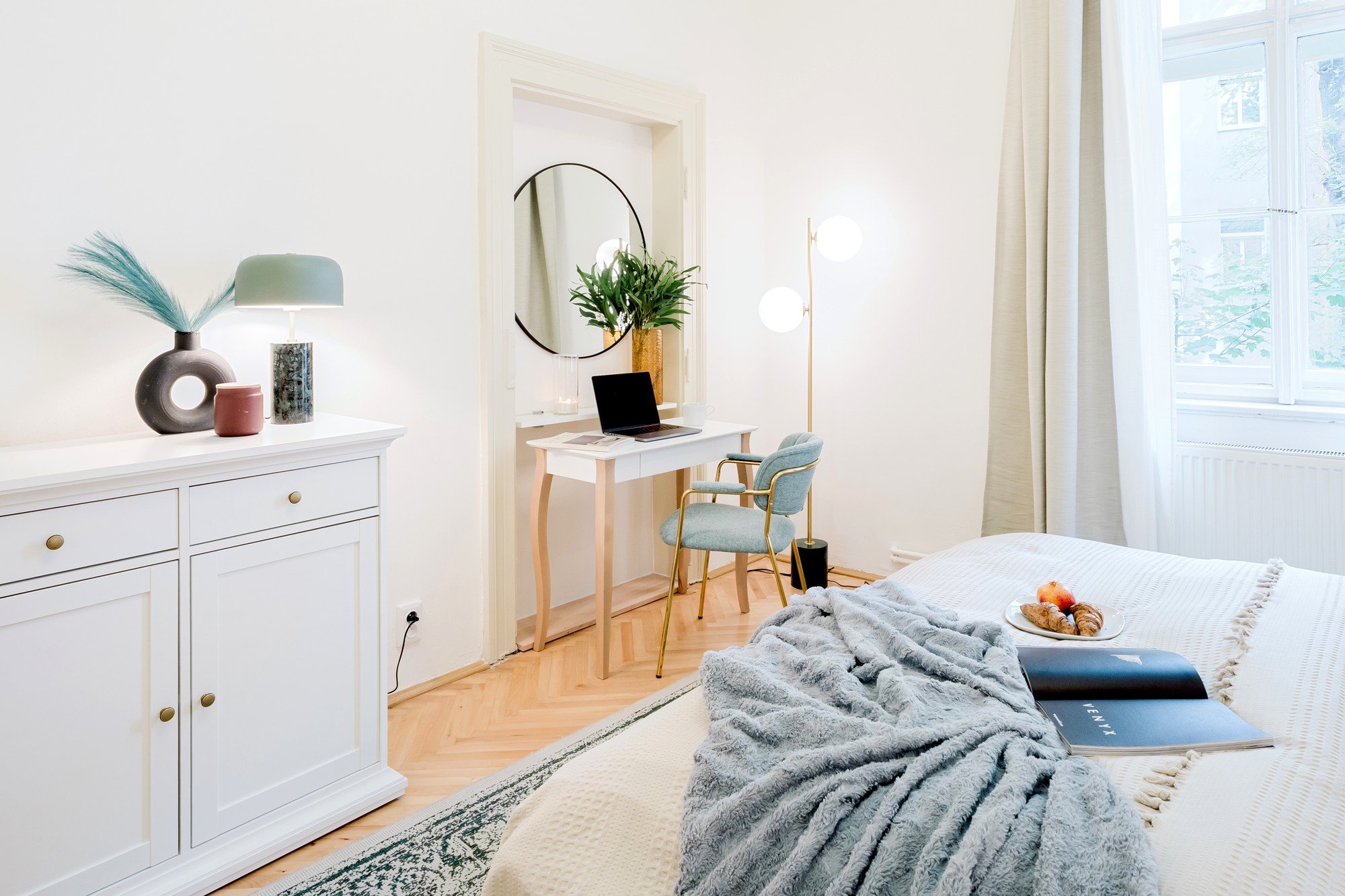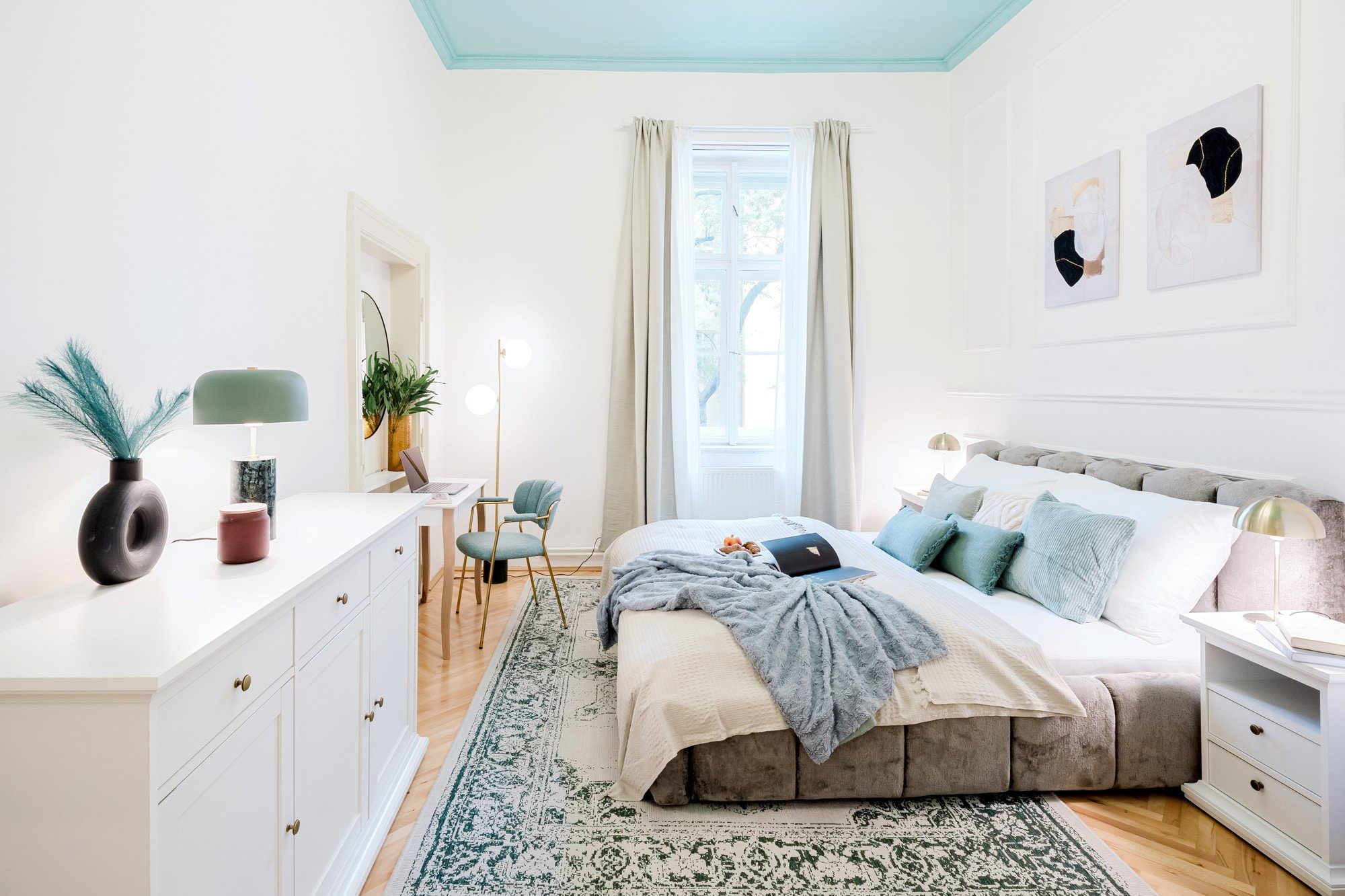 Apartamentul cu trei camere destinat închirierii pe termen scurt a fost amenajat într-o clădire veche din Praga, cu tavane înalte. Tocmai înălțimea impresionantă a acestora a constituit principala sursă de inspirație pentru întregul proiect. Tavanele colorate conferă interiorului un caracter distinctiv și subliniază proporțiile acestuia, în timp ce elementele glamour, cornișele decorative și detaliile aurii transformă întregul apartament într-un ansamblu elegant și memorabil.