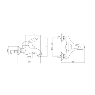 Acest robinet de baie montat pe perete din alamă are un control cu pârghie și un comutator de presiune pentru baie/duș. Deoarece este furnizat fără accesorii, trebuie achiziționate un duș de mână și un furtun de duș. Distanța de intrare a apei este de 150 mm.