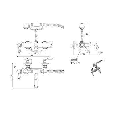 Baterie Vienna- pentru cadă, din alamă, cu montare pe perete, argintiu-lucios, 2 ieșiri