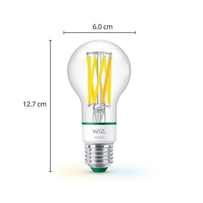 Becul smart WiZ cu filament este cel mai eficient bec din sistemul de iluminat inteligent WiZ. Datorită clasei sale energetice A, acesta consumă cu 40% mai puțină energie decât becurile LED standard.