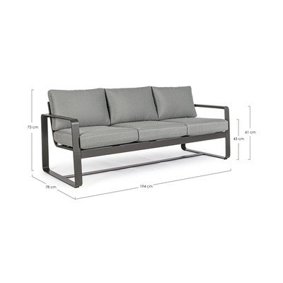 Cu un cadru simplu din aluminiu durabil, canapeaua este completată de perne confortabile în gri, având un aspect minimalist. Canapeaua din aluminiu este ușoară, dar și rezistentă la intemperii.