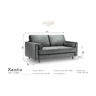 Canapeaua din catifea Santo, cu 2 perne decorative, oferă un spațiu de relaxare excelent și adaugă o notă de design și lux interiorului. Țesăturile folosite de brandul Milo Casa sunt supuse unor teste riguroase care garantează durabilitatea maximă, confort și stil atractiv. Pentru acoperirea canapelei a fost folosită o țesătură elegantă, cu o ușoară strălucire și cu păr scurt, care este plăcut la atingere și, de asemenea, rezistent la abraziune.