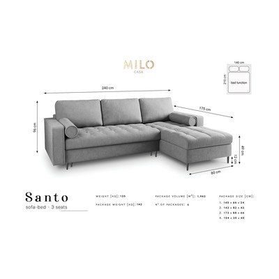 O canapea spațioasă, pe care să se cuibărească cu toții, este fundamentul unei cameră de zi de familie. Brandul Milo Casa din Italia știe acest lucru și se impune printr-o calitate rafinată și un design impresionant și elegant. Canapeaua extensibilă Santo oferă un spațiu de relaxare excelent pentru întreaga familie și adaugă o luxuriantă interiorului. Țesăturile folosite de brand sunt supuse unor teste riguroase pentru a garanta durabilitate maximă, confort și stil atractiv. Astfel, pentru acoperirea acestei canapele a fost folosită o țesătură frumoasă, cu o ușoară strălucire și cu un fir scurt, plăcută la atingere și, de asemenea, rezistentă la abraziune.