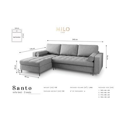 O canapea spațioasă, pe care să se cuibărească cu toții, este fundamentul unei cameră de zi de familie. Brandul Milo Casa din Italia știe acest lucru și se impune printr-o calitate rafinată și un design impresionant și elegant. Canapeaua extensibilă Santo oferă un spațiu de relaxare excelent pentru întreaga familie și adaugă o luxuriantă interiorului. Țesăturile folosite de brand sunt supuse unor teste riguroase pentru a garanta durabilitate maximă, confort și stil atractiv. Astfel, pentru acoperirea acestei canapele a fost folosită o țesătură frumoasă, cu o ușoară strălucire și cu un fir scurt, plăcută la atingere și, de asemenea, rezistentă la abraziune.
