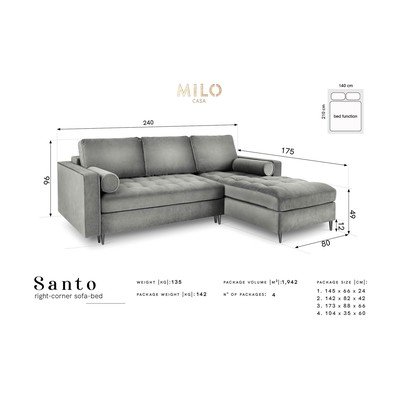 Colțarul extensibil Milo Casa Santo cu suprafață de catifea va oferi un spațiu de relaxare excelent pentru întreaga familie și va adăuga o notă de lux interiorului. Țesăturile folosite de brand sunt supuse unor teste riguroase care garantează durabilitate maximă, confort și stil atractiv. Astfel, pentru acoperirea canapelei a fost folosită o țesătură elegantă, cu o ușoară strălucire și cu un fir scurt, plăcută la atingere și, de asemenea, rezistentă la abraziune.
