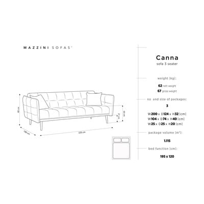 Design elegant, tapițerie matlasată și culori discrete - astfel poate fi descrisă colecția Canna de la brandul Canapele Mazzini . Canapeaua este rabatabilă , oferind suficient spațiu pentru un somn confortabil. Picioarele sunt realizate din lemn de fag , iar culoarea lor este foarte plăcută și naturală. Canapeaua vine, de asemenea, cu 2 perne de 45 x 45 cm de aceeași culoare cu canapeaua.
