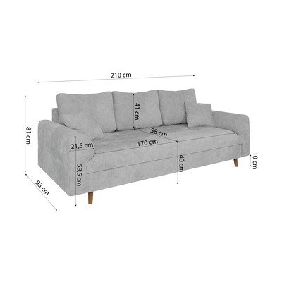 - cu tapițerie din chenille, gri, cu 3 locuri, lățime 210 cm, adâncime 93 cm, adâncime șezut 41 cm
