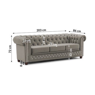 - cu tapițerie din catifea, extensibilă, chesterfield, gri, rezistentă la apă/rezistentă la pete, cu 2 locuri, lățime 203 cm