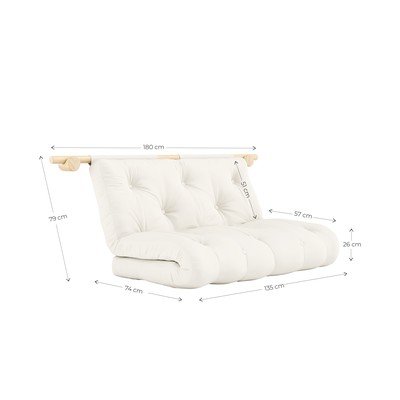 Canapeaua este echipată cu patru suporturi de perete care o țin bine în poziție, permițându-i în același timp să funcționeze ca element decorativ în cameră. Pentru a sta jos, o poți pune pur și simplu într-o poziție mai joasă. Dacă ai nevoie de un loc pentru a dormi, desfășoară canapeaua pe podea. Suporturile pot fi instalate în camere diferite, permițând mutarea canapelei după cum este necesar. Bara de design are o lățime de 180 cm.