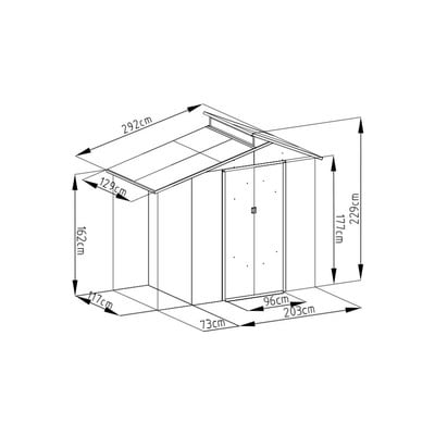 Ușile glisante duble de 96 x 177 cm oferă acces convenabil la articolele depozitate. Casa este fabricată din foi de oțel galvanizat la cald de înaltă calitate, cu o grosime de 0,25 - 0,30 mm și grile de ventilație. Foile sunt ținute împreună de un cadru din oțel galvanizat cu grosimea de 0,5 - 0,8 mm și de un cadru perimetral, care trebuie fixat pe o bază plană (beton, gresie, podea din lemn...) folosind șuruburile de ancorare incluse.
