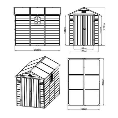 Datorită materialului plastic de înaltă calitate, această căsuță de grădină de la Rojaplast se caracterizează prin ușurință și durabilitate, chiar și împotriva radiațiilor UV și a condițiilor meteorologice. Rezistența necesară a întregii structuri este asigurată de armături metalice, panouri exterioare din plastic (12 mm) și stâlpi din plastic (1,5 mm).