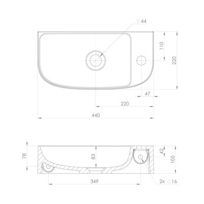 - din compozit mineral, albă, lățime 44 cm, adâncime 22 cm, înălțime 10,5 cm