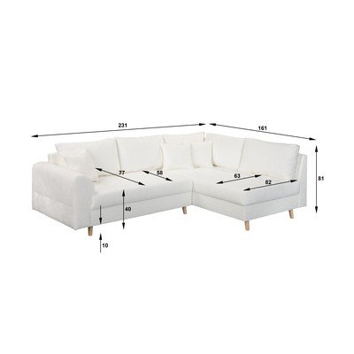 - cu tapițerie din țesătură bouclé, cu colț pe partea dreaptă/în formă de ”L”, alb, cu 3 locuri, lățime 231 cm