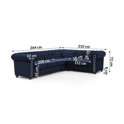 - cu tapițerie din catifeaExtensibilChesterfieldCu colț pe partea dreaptă/în formă de ”L”AlbastruRezistent la apă/rezistent la peteCu 4 locuriLățime 264 cm
