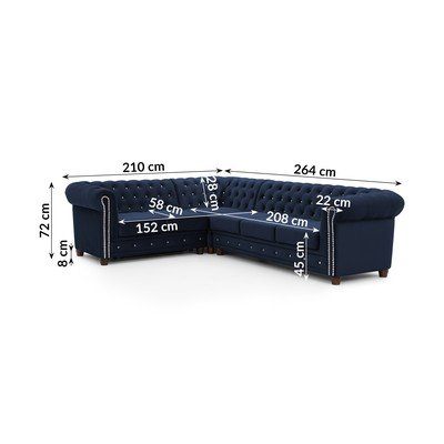 - cu tapițerie din catifeaExtensibilChesterfieldCu colț pe partea stângă/în formă de ”L”AlbastruRezistent la apă/rezistent la peteCu 4 locuriLățime 264 cm