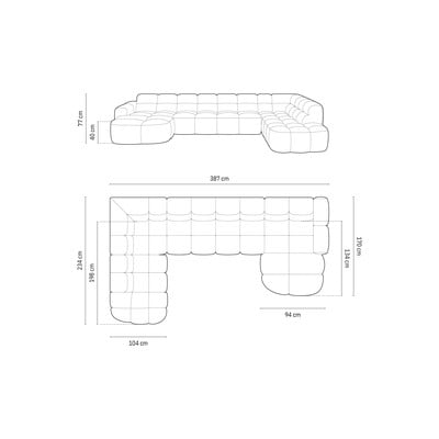 - cu colț pe partea stângă/în formă de "U", albastru, cu 5 sau mai multe locuri, lățime 387 cm, adâncime 234 cm, adâncime șezut 58 cm