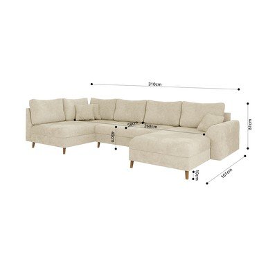 - cu tapițerie din chenille, cu colț pe partea dreaptă/în formă de "U", bej, cu 5 sau mai multe locuri, lățime 310 cm