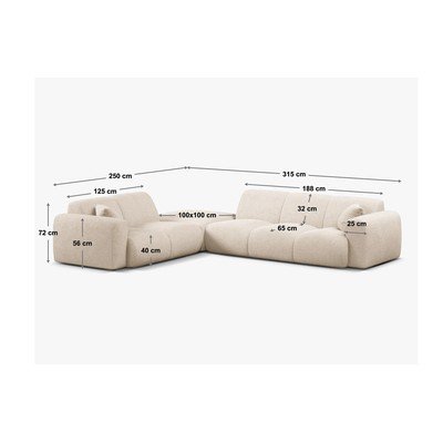 - cu tapițerie din țesătură boucléCu colț pe partea dreaptă/în formă de ”L”BejCu 5 sau mai multe locuriLățime 315 cmAdâncime 250 cmAdâncime șezut 68 cm