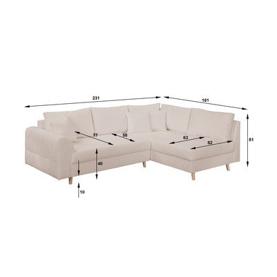 - cu tapițerie din țesătură bouclé, cu colț pe partea dreaptă/în formă de ”L”, bej, cu 3 locuri, lățime 231 cm