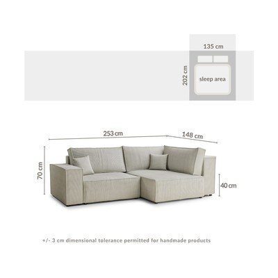 - cu tapițerie din catifea reiată Extensibil/cu spațiu de depozitareCu colț pe partea dreaptă/în formă de ”L”Potrivit pentru animale de companieBejCu 3 locuriLățime 253 cmAdâncime 148 cmAdâncime șezut 65 cm