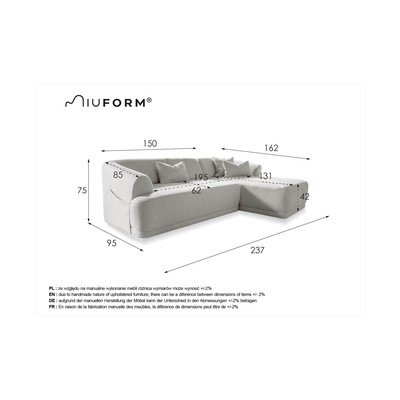- cu colț pe partea dreaptă/cu șezlong, bej, cu 2 locuri, lățime 237 cm, adâncime 162 cm, adâncime șezut 69 cm
