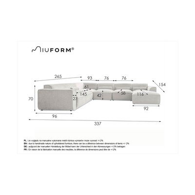 - cu colț pe partea stângă/în formă de "U"CremCu 5 sau mai multe locuriLățime 337 cmAdâncime 265 cmAdâncime șezut 58 cm