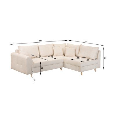 - cu tapițerie din catifea reiată , cu colț pe partea dreaptă/în formă de ”L”, bej, cu 3 locuri, lățime 231 cm