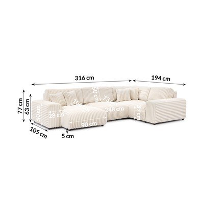 - cu tapițerie din catifea reiată Cu colț pe partea dreaptă/în formă de "U"CremRezistent la apă/rezistent la peteCu 4 locuriLățime 316 cm