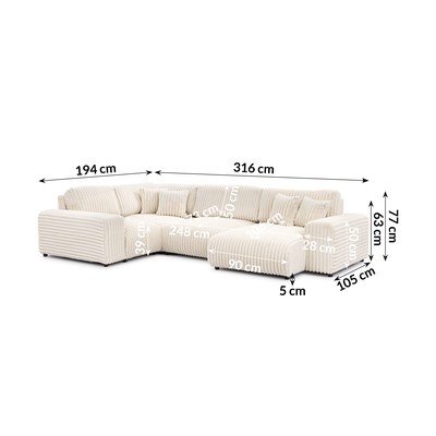 - cu tapițerie din catifea reiată Cu colț pe partea stângă/în formă de "U"CremRezistent la apă/rezistent la peteCu 4 locuriLățime 316 cm