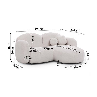 - cu tapițerie din țesătură boucléCu colț pe partea dreaptă/cu șezlongCremRezistent la apă/rezistent la peteCu 2 locuriLățime 190 cm