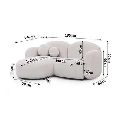 - cu tapițerie din țesătură boucléCu colț pe partea stângă/cu șezlongCremRezistent la apă/rezistent la peteCu 2 locuriLățime 190 cm