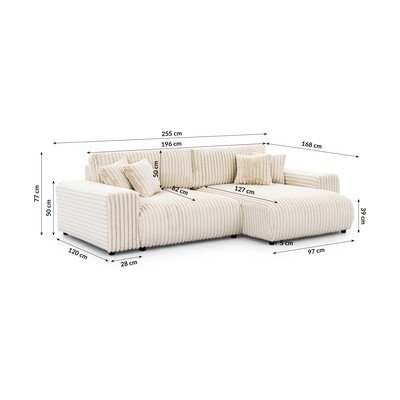 - cu tapițerie din catifea reiată Extensibil/cu spațiu de depozitareCu colț pe partea dreaptăCremRezistent la apă/rezistent la peteCu 3 locuriLățime 255 cm