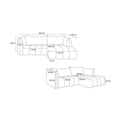 - cu tapițerie din țesătură bouclé, cu colț pe partea dreaptă/cu șezlong, gri, cu 3 locuri, lățime 262 cm